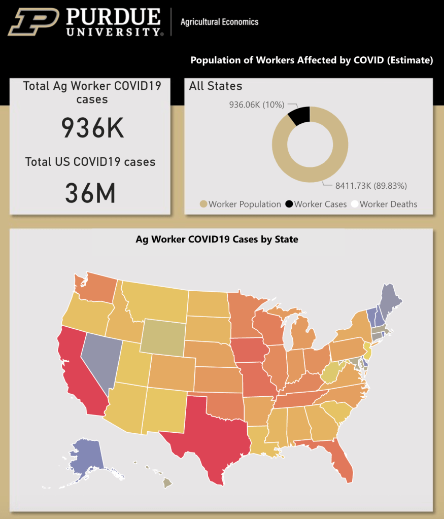 A study by Purdue University reported that at least 936,000 agricultural workers have tested positive for COVID-19 as recent as August 2021. The total is likely an underestimation due to undocumented and migrant workers not having access to healthcare resources.
