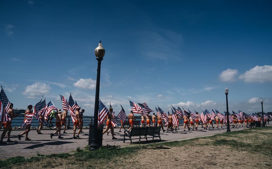 Those who are deemed fit start their trial at the Empty Sky Memorial in Liberty State Park, N.J. After entering the water in their matching swim trunks, the athletes swim to the Statue of Liberty where they complete 100 pushups and 22 pullups. Next, participants backtrack to Ellis Island and commit to another round of pushups and pullups. The final leg of the event has competitors swim across the Hudson River to New York’s Battery Park, grab a waiting American flag and jog to One World Trade Center for one last exercise set.